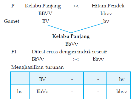 Rasio fenotipe hasil testcross ialah kelabu-sayap panjang : hitam-sayap pendek 1:1. Ini berarti macam gamet rekombinan tidak muncul, sebab b bertaut V, b bertaut v, sehingga gamet yang dihasilkan F1 hanya BV dengan bv. Karena rasio gamet BV dengan bv 1:1 maka rasio fenotipe hasil testcross. Bbvv : bbvv = lalat buah kelabu-sayap panjang : hitam-sayap pendek = 1:1.