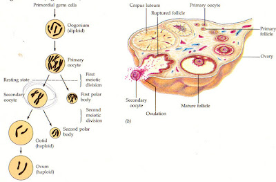 Sel primordial ovum atau oogenesis yang bersifat diploid (2n) membelah secara mitosis berkali-kali dan menjadi oosit primer (2n). Oosit primer akan melakukan pembelahan meiosis I dan akan menjadi oosit sekunder dan haploid (n) kemudian menjadi badan polar atau sel polosit sekunder (n). Sedangkan sel polosit primer membelah menjadi dua buah sel polosit sekunder (n).